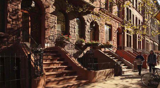 紐約、波士頓是最著(zhù)名的褐石城市,Cobble Hill、Park Slope、Back Bay、格林威治村、百老匯大街是最著(zhù)名的褐石街區等等。